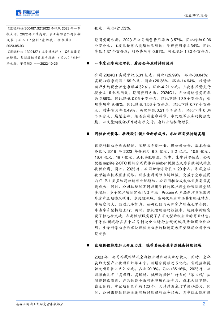 国海证券:蓝晓科技(300487)-2023年年报及2024年一季报点评报告:业绩同比提升,看好公司持续成长.pdf