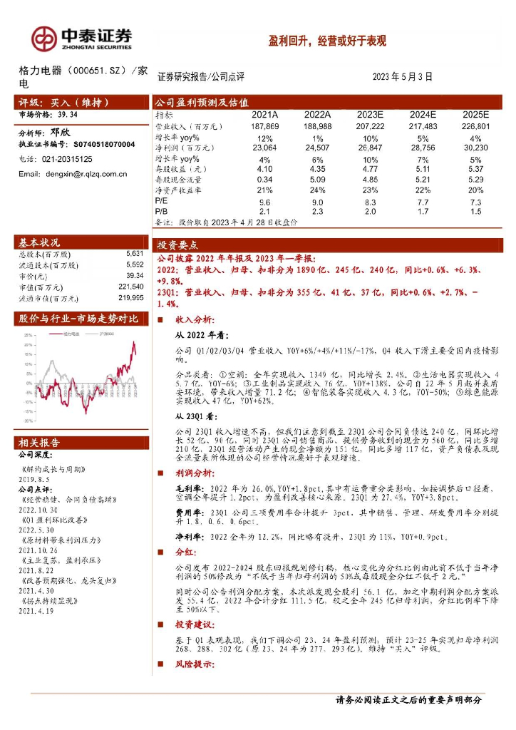 中泰证券:格力电器(000651)-盈利回升,经营表现或好于表观.pdf