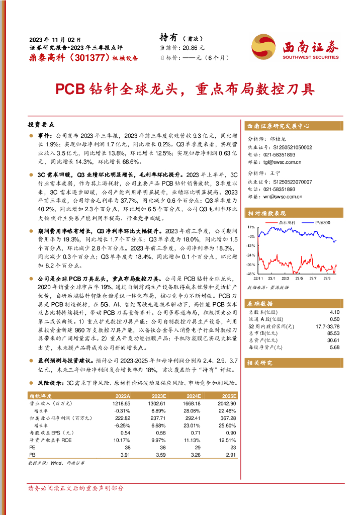西南证券:鼎泰高科(301377)-2023年三季报点评:PCB钻针全球龙头,重点布局数控刀具.pdf