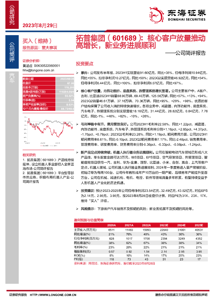 东海证券:拓普集团(601689)-公司简评报告:核心客户放量推动高增长,新业务进展顺利.pdf