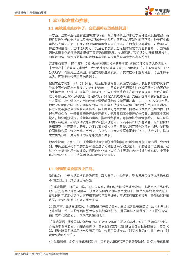 天风证券:农林牧渔行业研究周报:2021年第39周周报:继续重点推荐种业机会;关注生猪产能调控新方案推进!.pdf