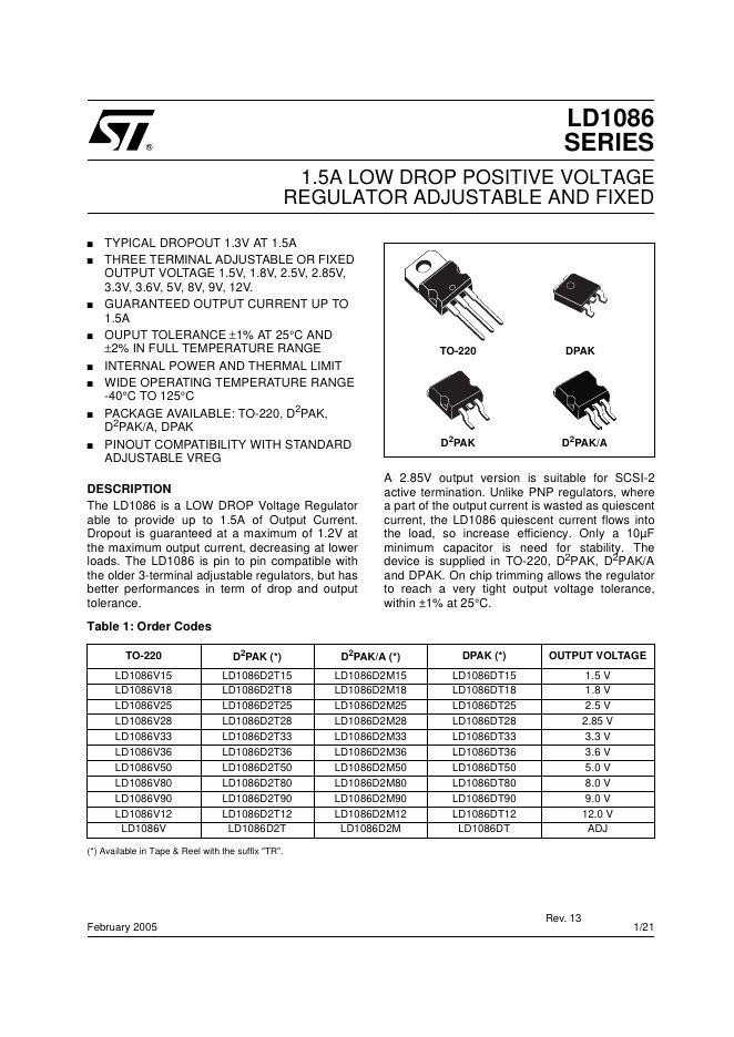 ST LD1086 SERIES 1.5A LOW DROP POSITIVE VOLTAGE REGULATOR ADJUSTABLE AND FIXED 数据手册.pdf