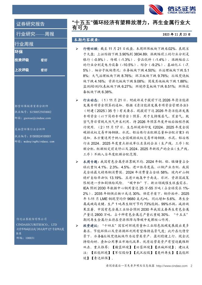 信达证券:环保行业周报:“十五五”循环经济有望释放潜力,再生金属行业大有可为.pdf
