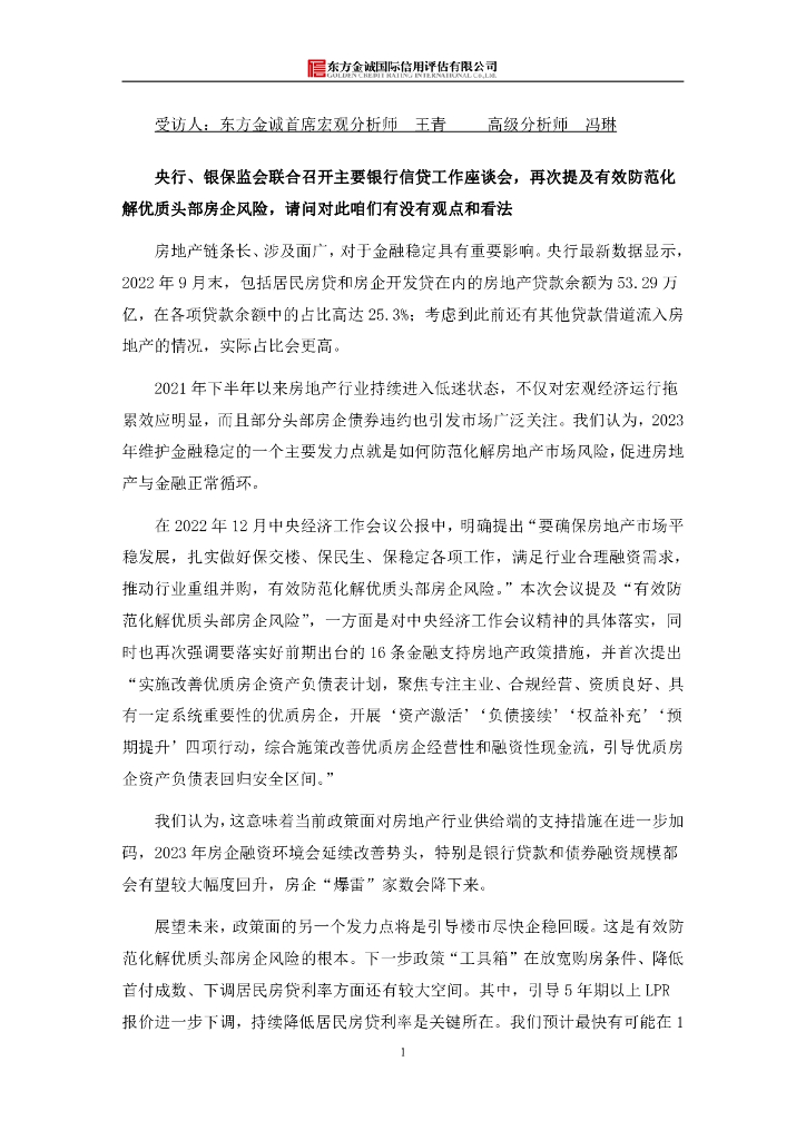 东方金诚:央行、银保监会联合召开主要银行信贷工作座谈会简评.pdf