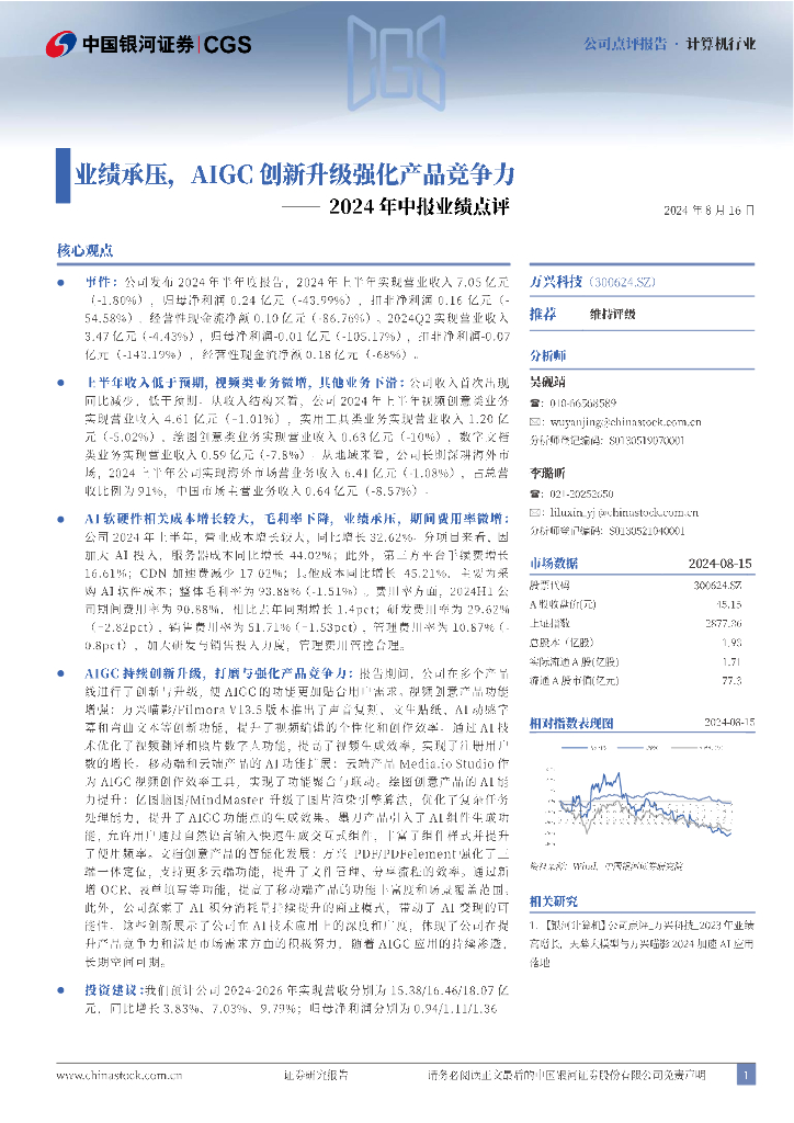 中国银河:万兴科技(300624)-2024年中报业绩点评:业绩承压,AIGC创新升级强化产品竞争力.pdf