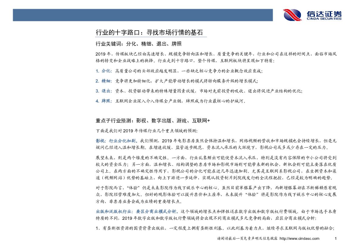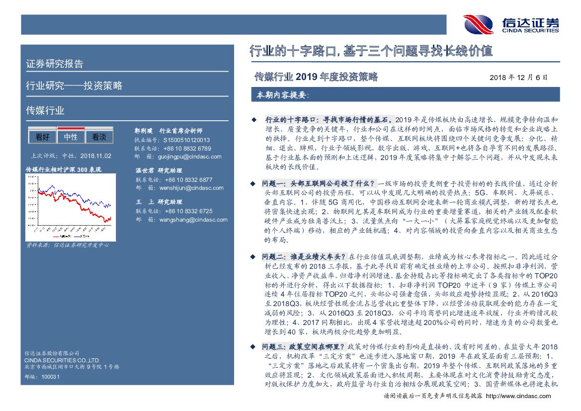 信达证券:传媒行业2019年度投资策略:行业的十字路口,基于三个问题寻找长线价值.pdf