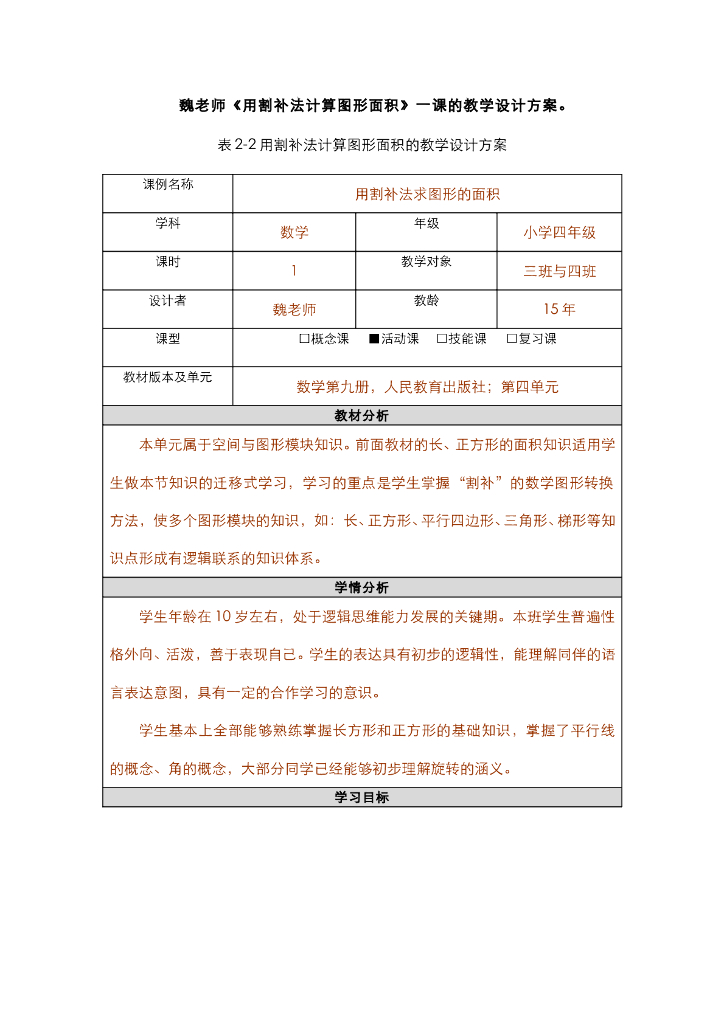 《现代教育技术应用》教学课件-第二章-第1节——案例研读:“老教师”的新课堂 学具:《用割补法计算图形面积》教学设计方案.pdf