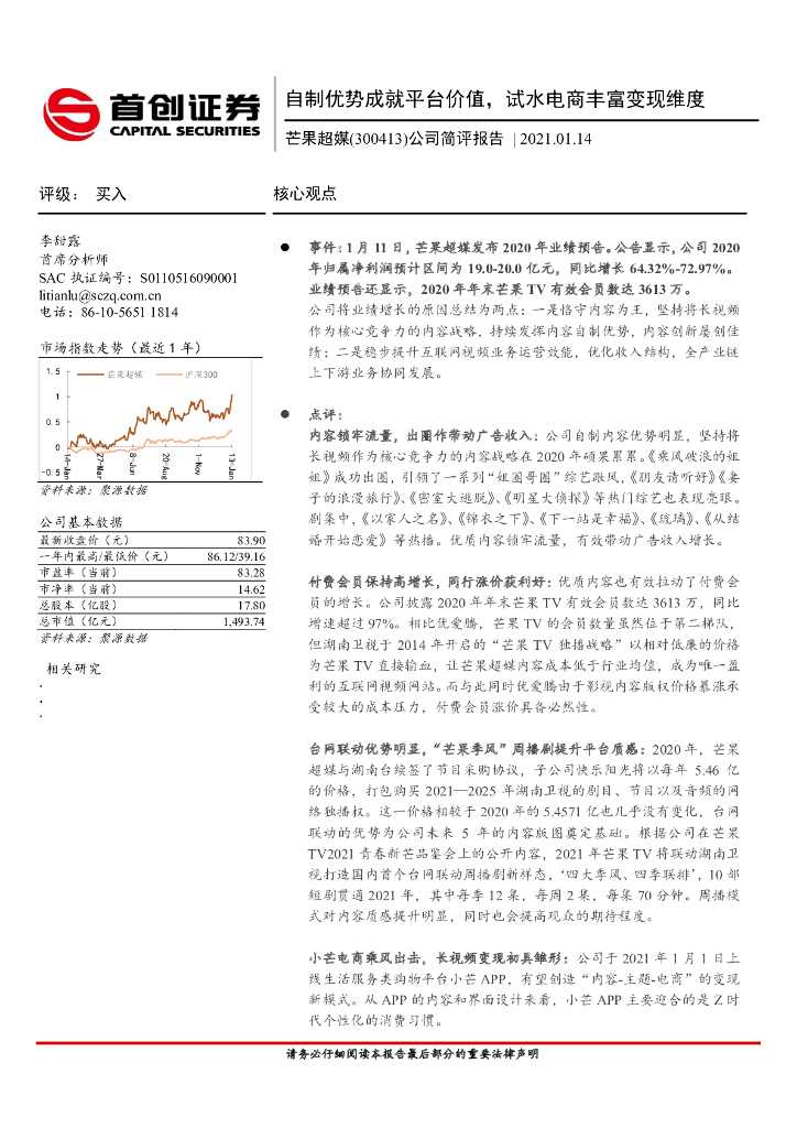 首创证券:芒果超媒(300413)-公司简评报告:自制优势成就平台价值,试水电商丰富变现维度.pdf
