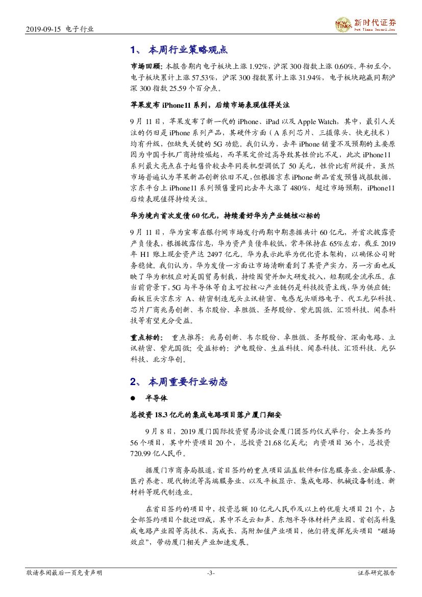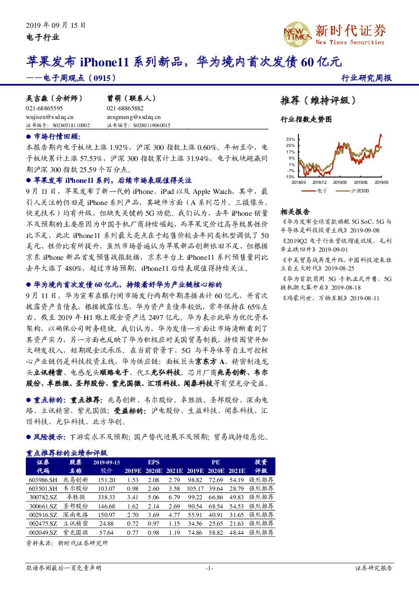 新时代证券:电子周观点:苹果发布iPhone11系列新品,华为境内首次发债60亿元.pdf