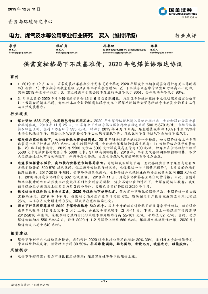 国金证券:电力、煤气及水等公用事业行业研究:供需宽松格局下不改基准价,2020年电煤长协难达协议.pdf
