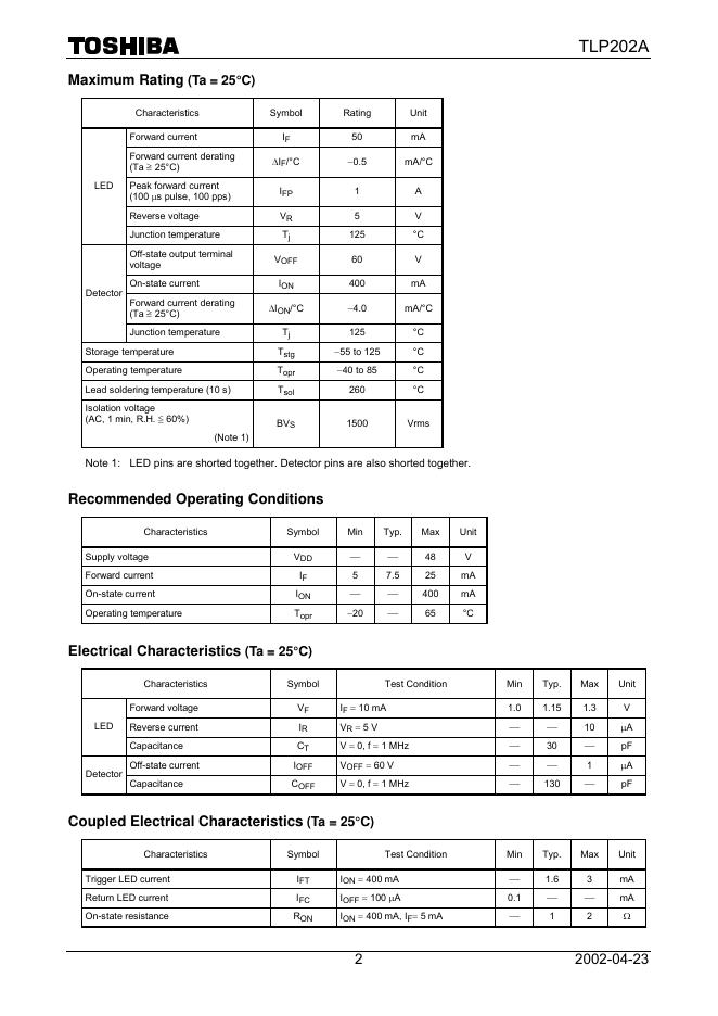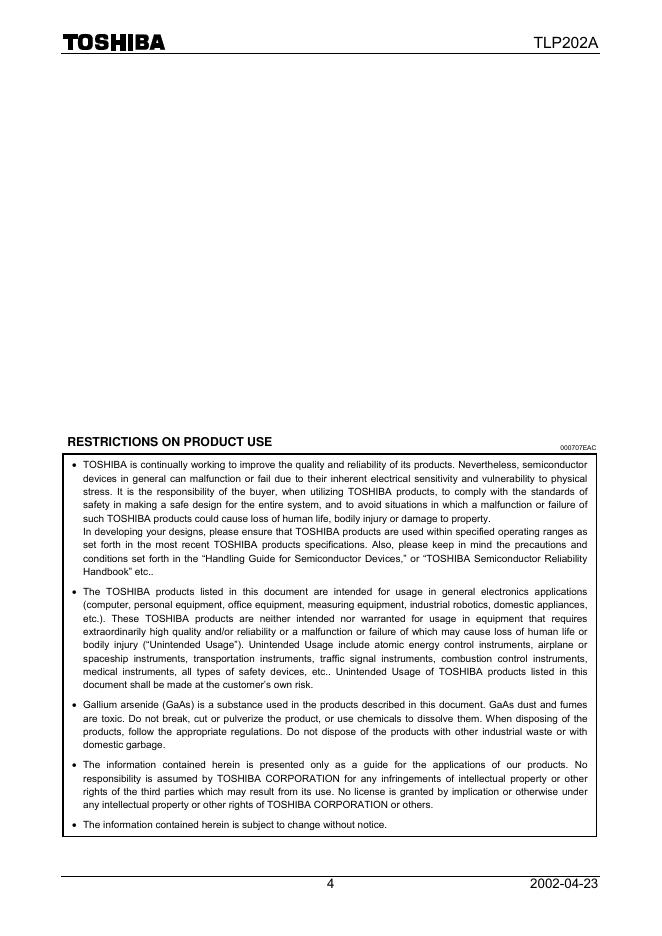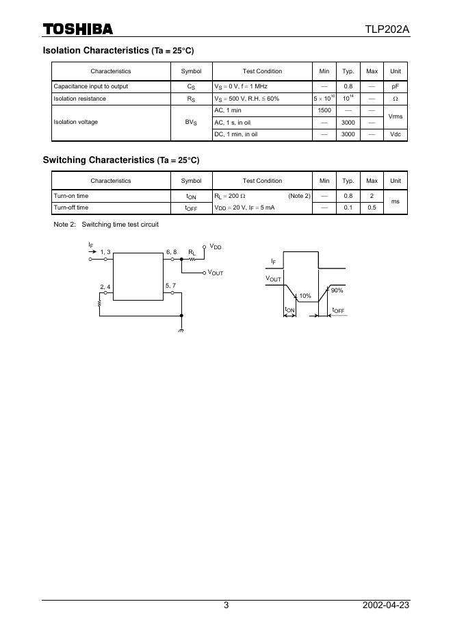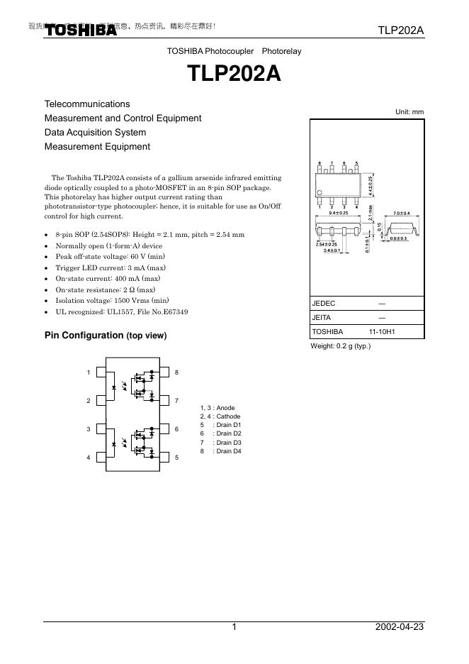 TOSHIBA Photocoupler Photorelay TLP202A 数据手册.pdf