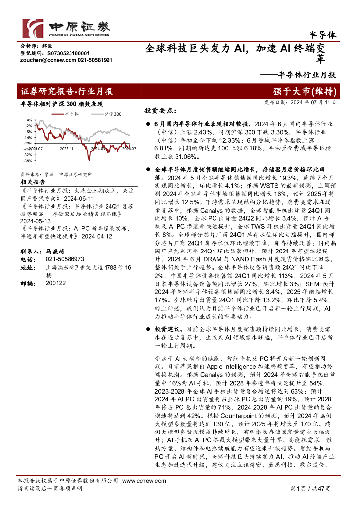 中原证券:半导体行业月报:全球科技巨头发力AI,加速AI终端变革.pdf