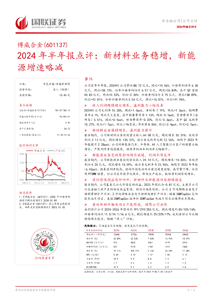 国联证券:博威合金(601137)-2024年半年报点评:新材料业务稳增,新能源增速略减.pdf