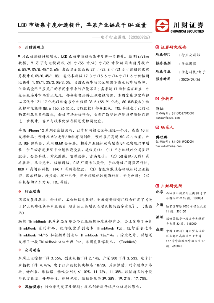 川财证券:电子行业周报:LCD市场集中度加速提升,苹果产业链或于Q4放量.pdf