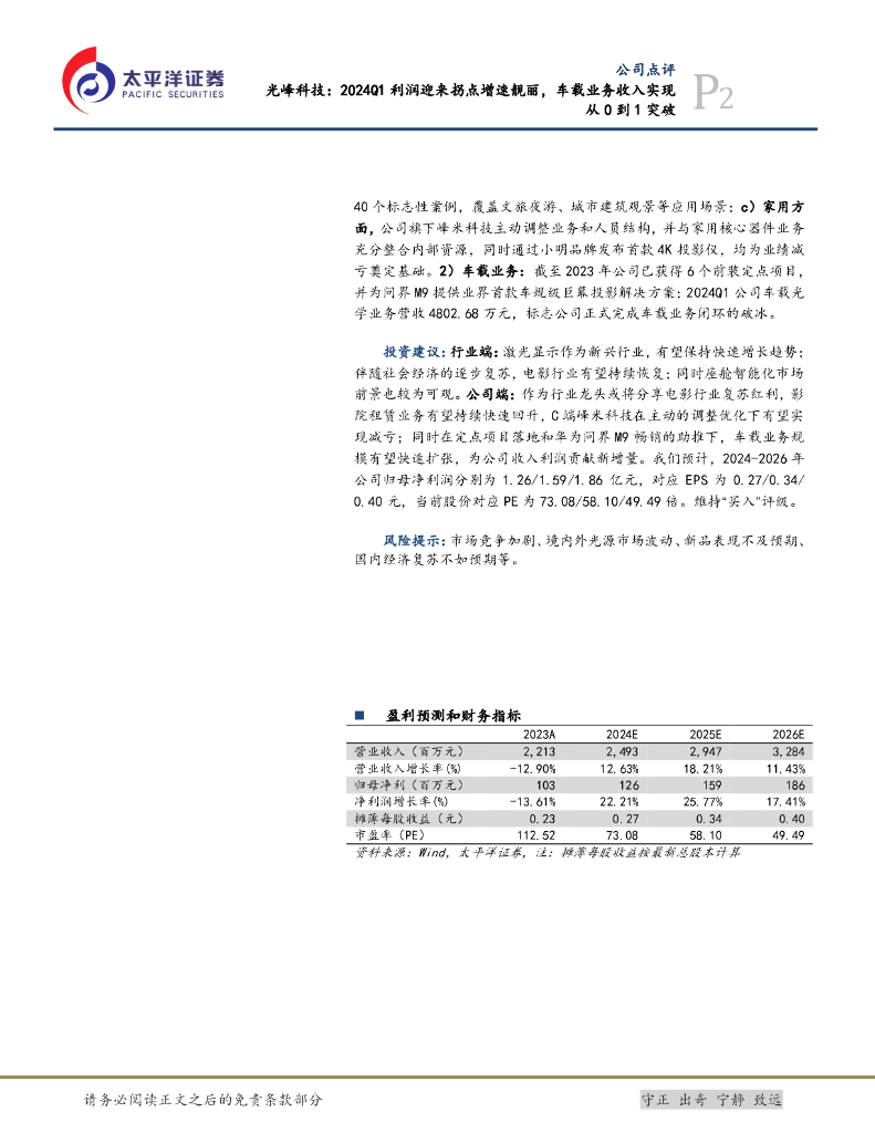 太平洋证券:光峰科技:2024Q1利润迎来拐点增速靓丽,车载业务收入实现从0到1突破.pdf