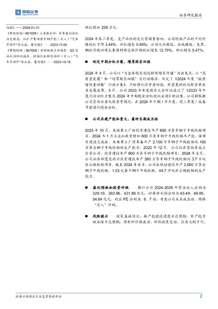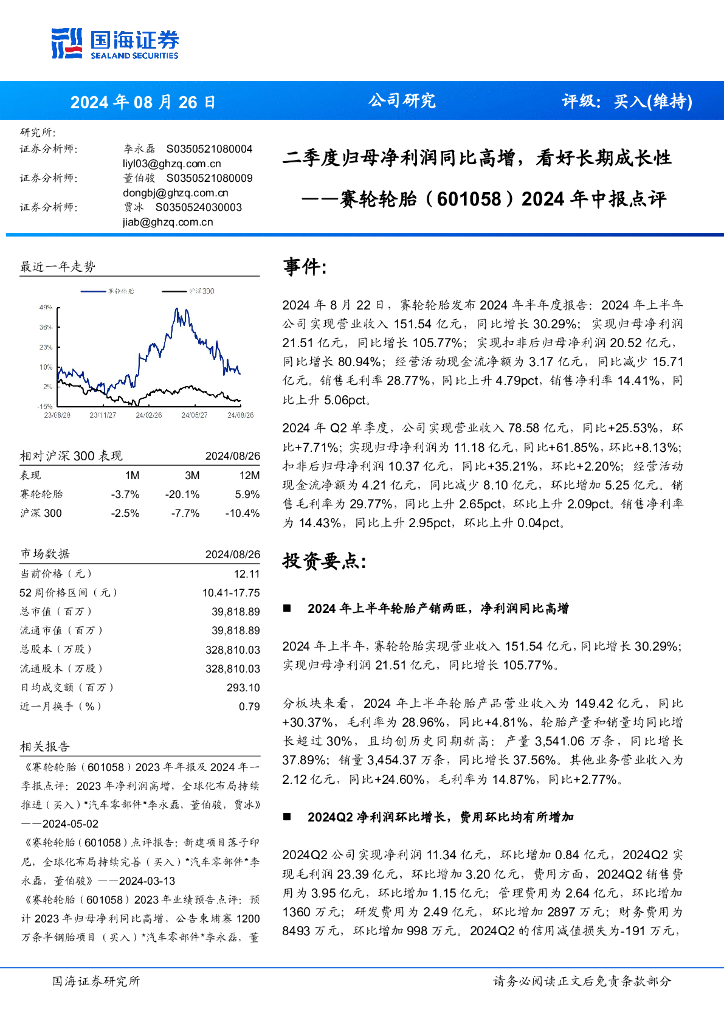 国海证券:赛轮轮胎(601058)-2024年中报点评:二季度归母净利润同比高增,看好长期成长性.pdf