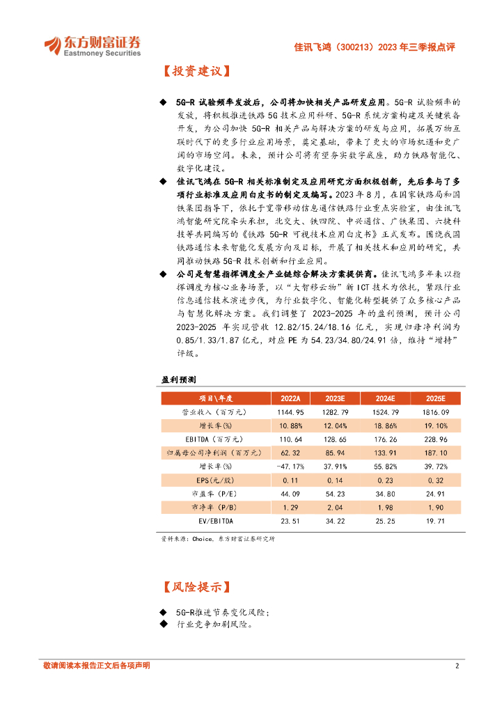 东方财富证券:佳讯飞鸿(300213)-2023年三季报点评:业绩稳健,完成5G-R指挥调度研发并超前布局行业智能化、数字化赋能产品(2023-10-26).pdf