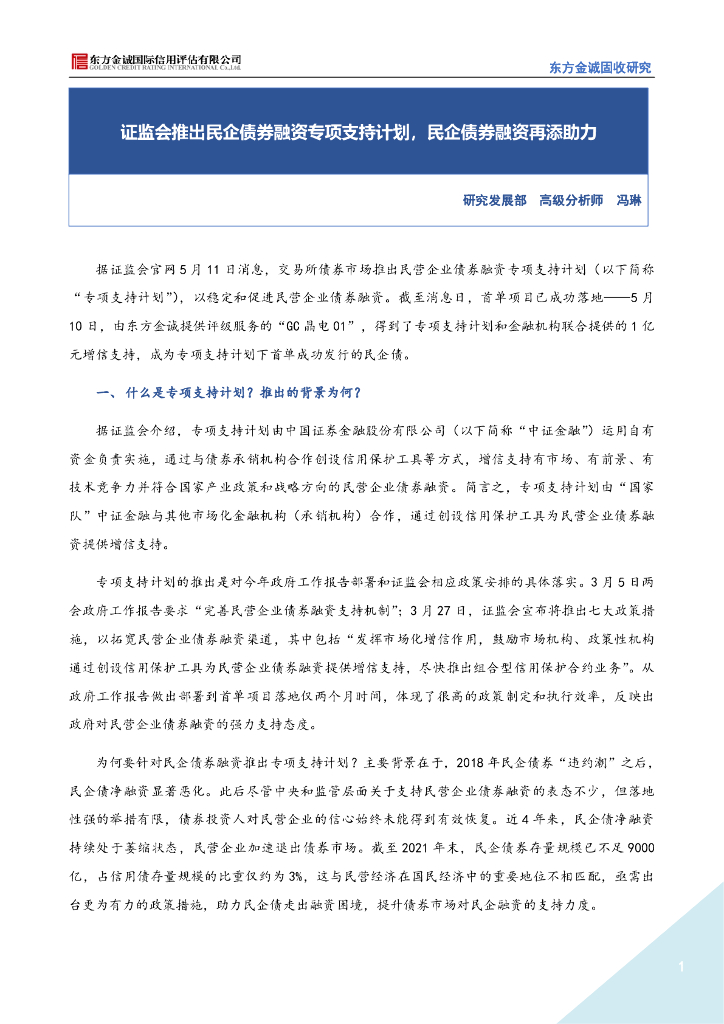东方金诚:证监会推出民企债券融资专项支持计划,民企债券融资再添助力.pdf