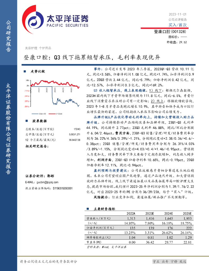 太平洋证券:登康口腔(001328)-Q3线下拖累短暂承压,毛利率表现优异.pdf
