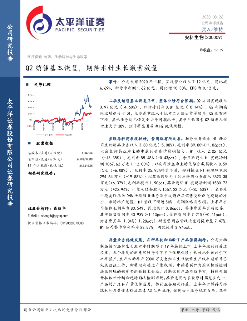 太平洋证券:安科生物(300009)-Q2销售基本恢复,期待水针生长激素放量.pdf