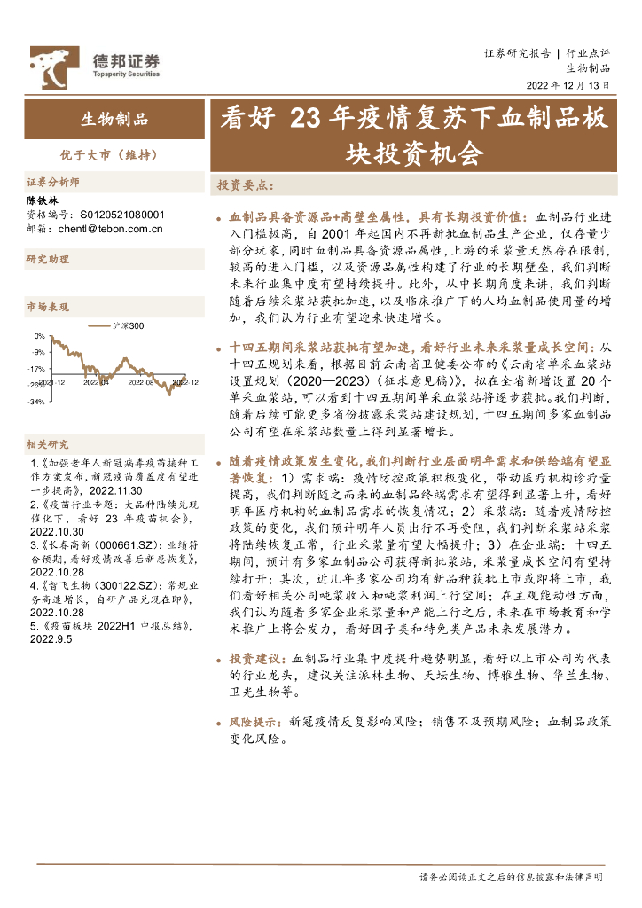 德邦证券:生物制品行业点评:看好23年疫情复苏下血制品板块投资机会.pdf