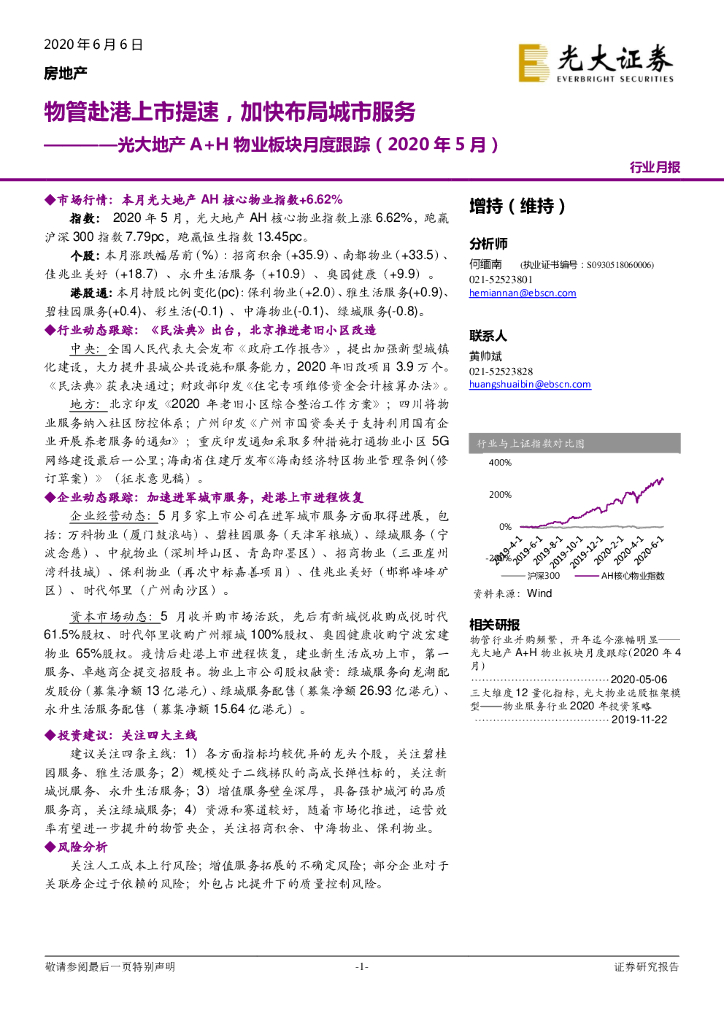 光大证券:光大地产A+H物业板块月度跟踪(2020年5月):物管赴港上市提速,加快布局城市服务.pdf