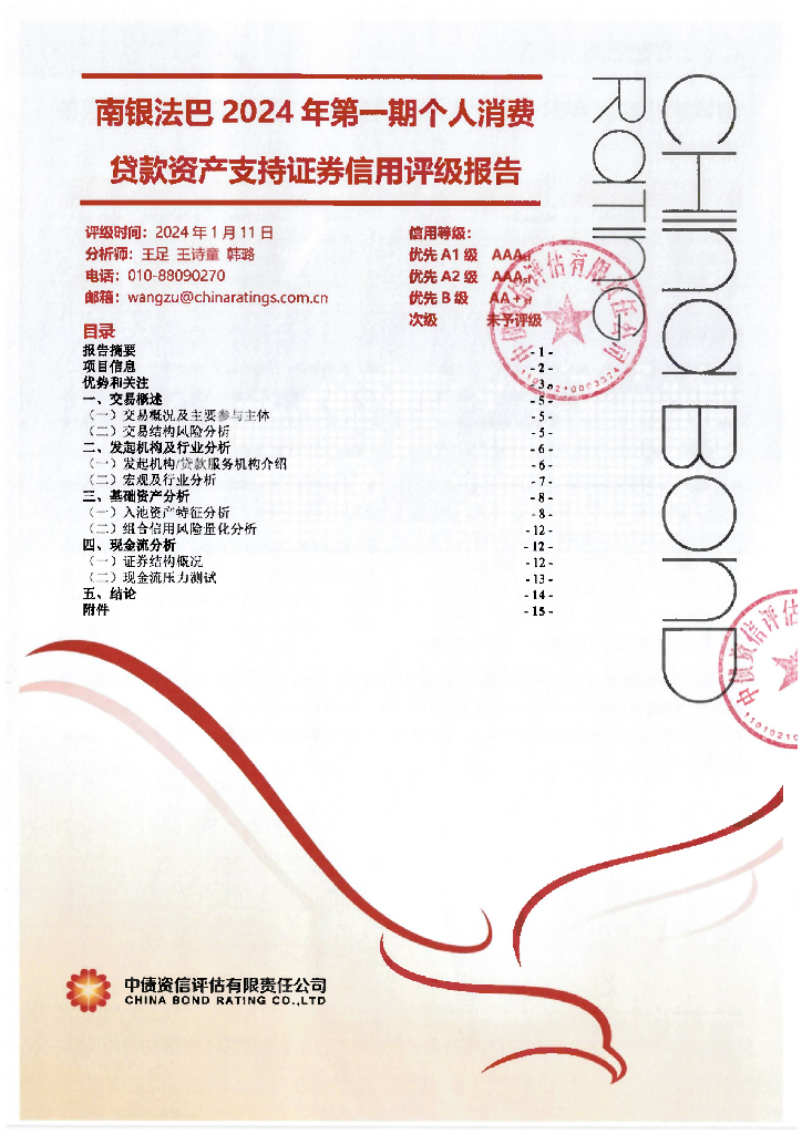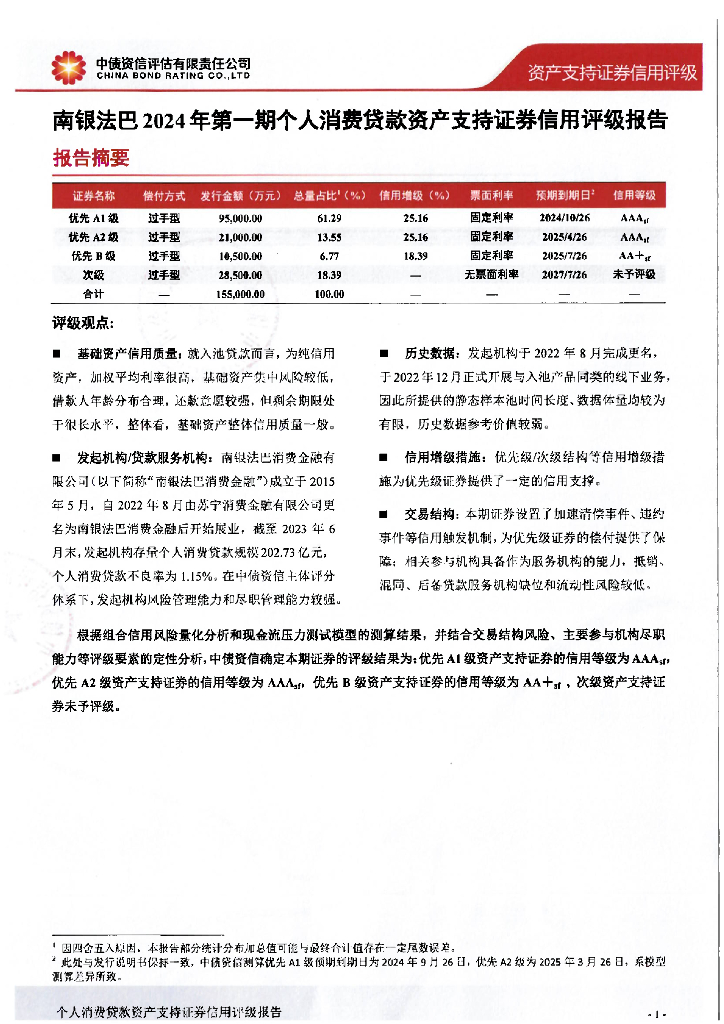 中债资信:南银法巴2024年第一期个人消费贷款资产支持证券信用评级报告及跟踪评级安排.pdf