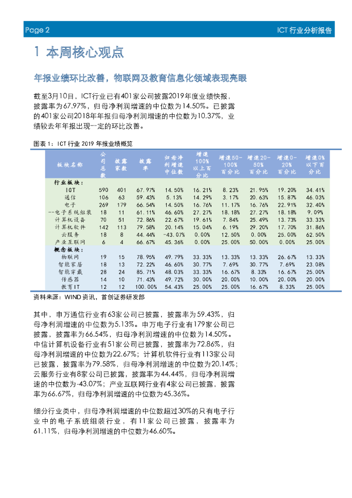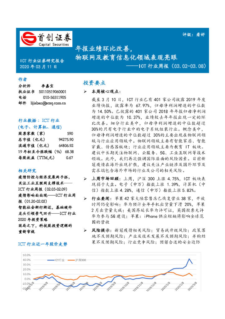 首创证券:ICT行业周报:年报业绩环比改善,物联网及教育信息化领域表现亮眼.pdf