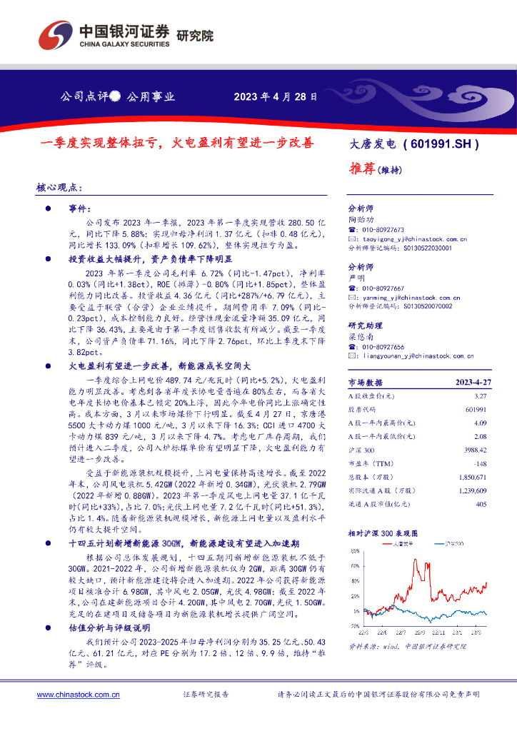 中国银河:大唐发电(601991)-一季度实现整体扭亏,火电盈利有望进一步改善.pdf