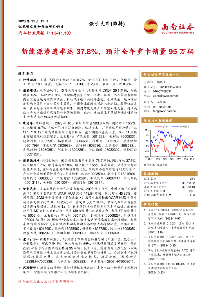 西南证券:汽车行业周报:新能源渗透率达37.8%,预计全年重卡销量95万辆.pdf