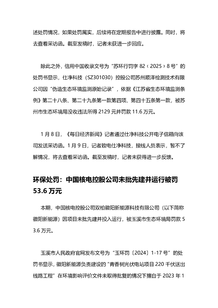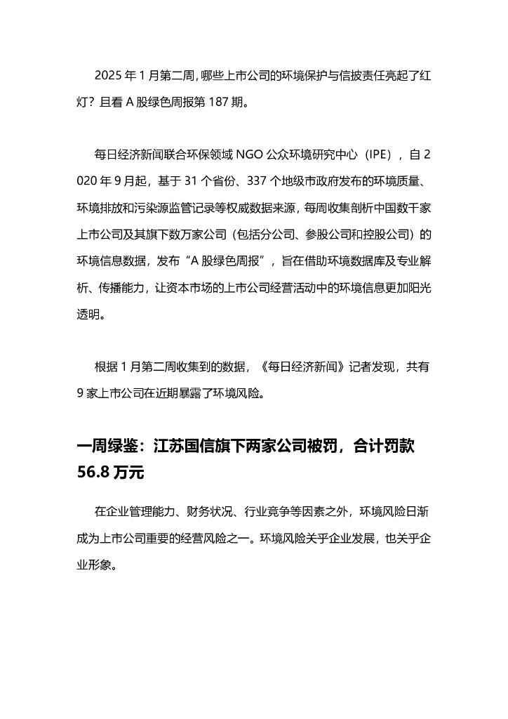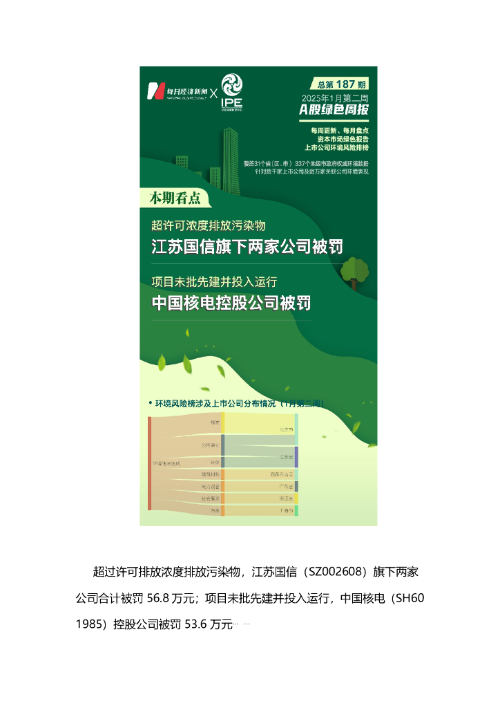 A股绿色周报(2025年1月第二周 总第187期):9家上市公司暴露环境风险 江苏国信旗下两家公司超许可排放污染物合计被罚56.8万元.pdf