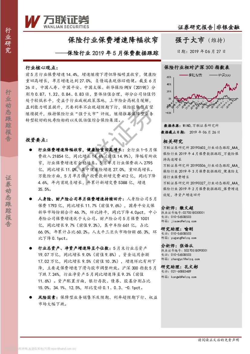 万联证券:保险行业2019年5月保费数据跟踪:保险行业保费增速降幅收窄.pdf
