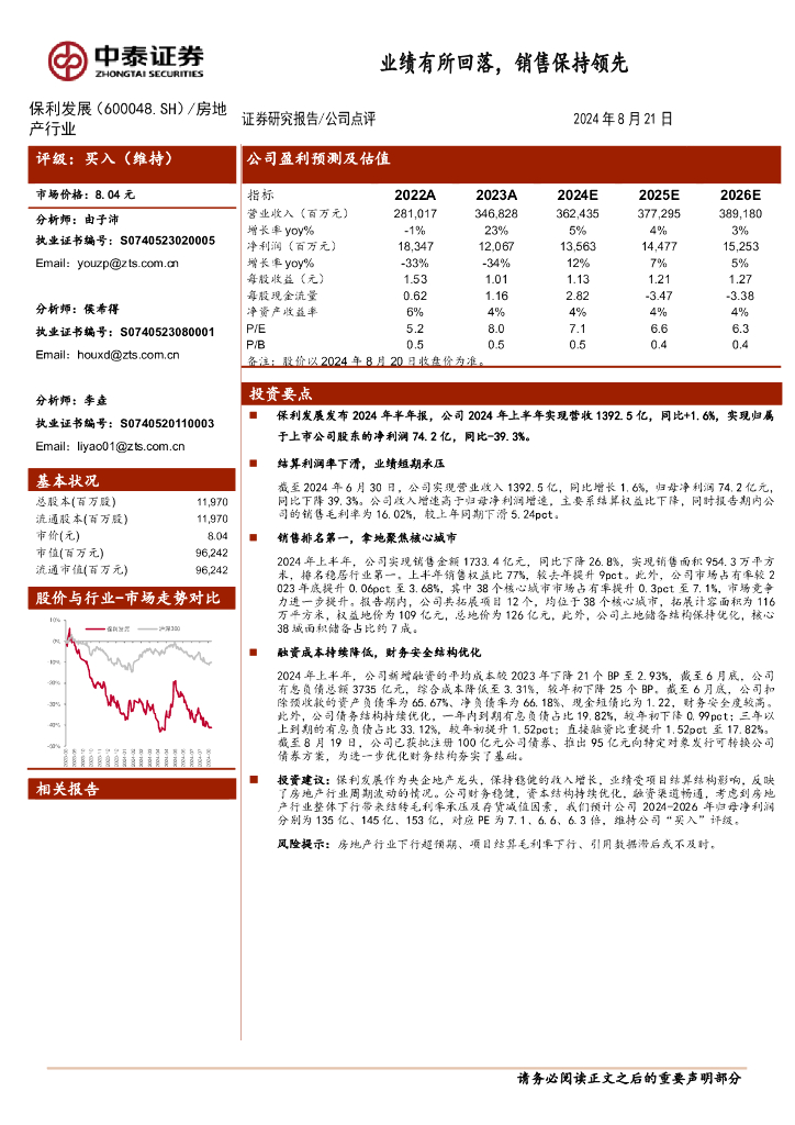 中泰证券:保利发展(600048)-业绩有所回落,销售保持领先.pdf