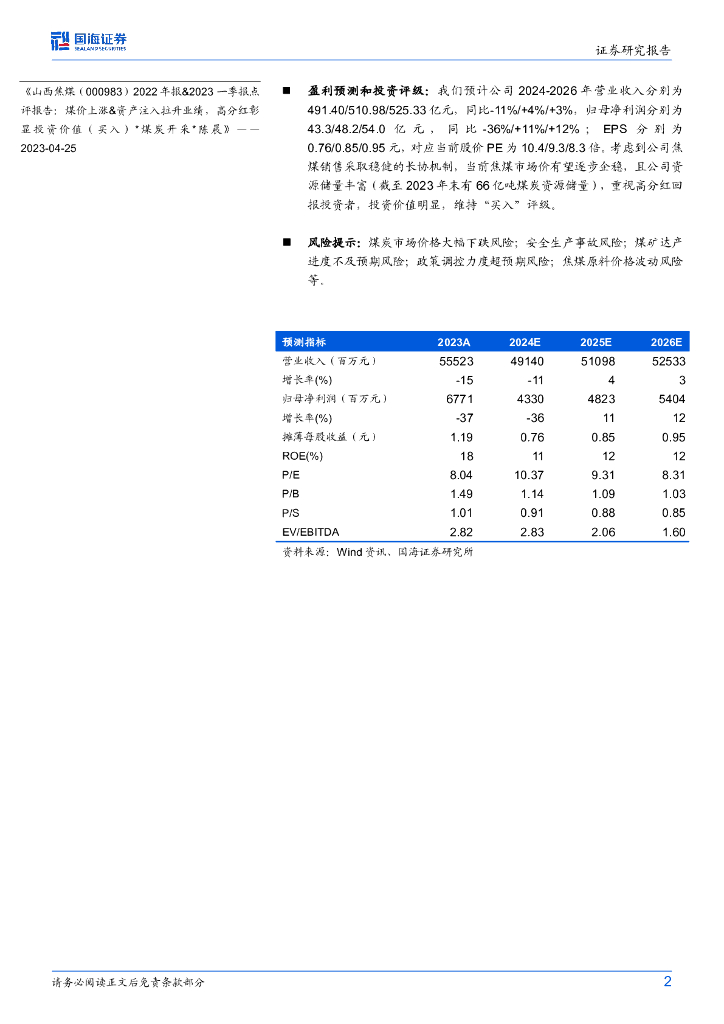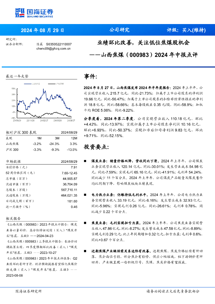 国海证券:山西焦煤(000983)-2024年中报点评:业绩环比改善,关注低位焦煤股机会.pdf