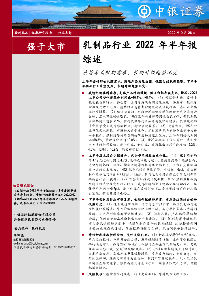 中银证券:乳制品行业2022年半年报综述:疫情影响短期需求,长期升级趋势不变.pdf