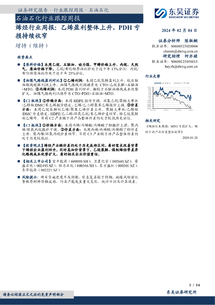 东吴证券:石油石化行业跟踪周报:烯烃行业周报,乙烯盈利整体上升,PDH亏损持续收窄.pdf