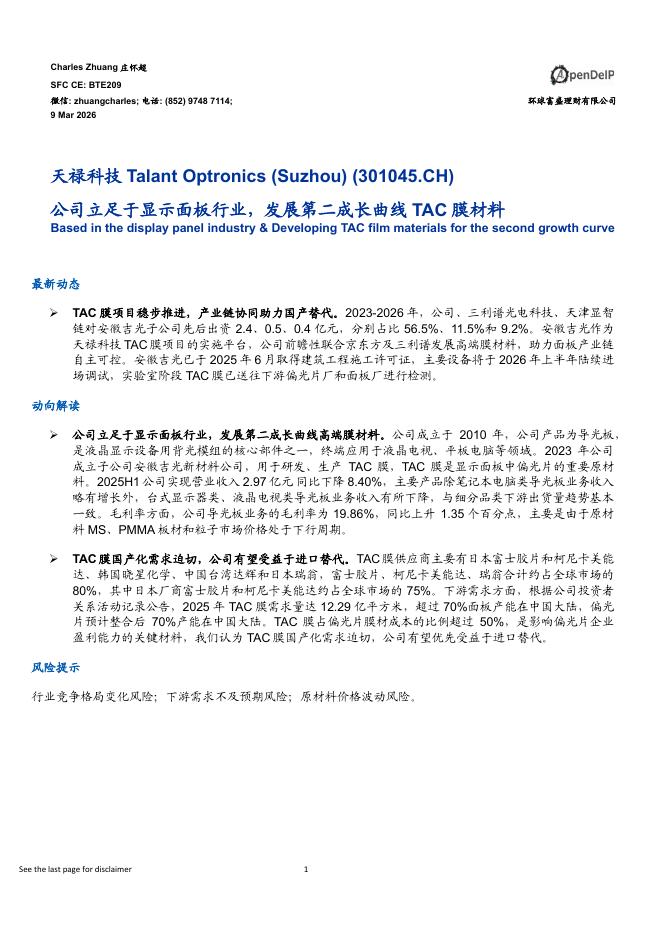 环球富盛理财:天禄科技(301045)-公司立足于显示面板行业,发展第二成长曲线TAC膜材料.pdf