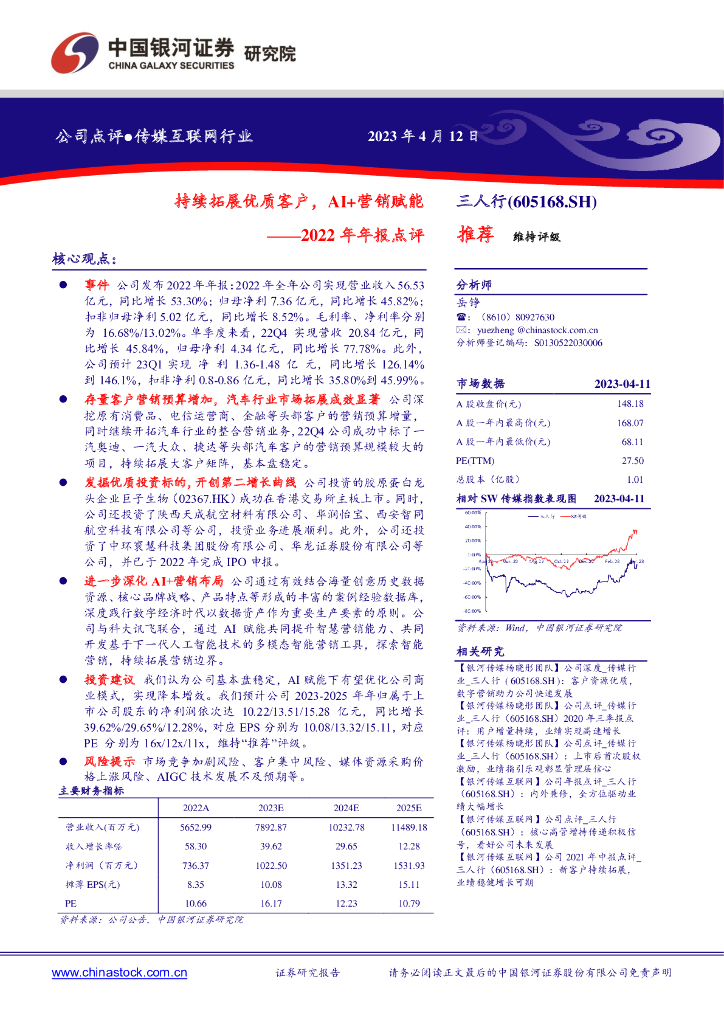 中国银河:三人行(605168)-2022年年报点评:持续拓展优质客户,AI+营销赋能.pdf