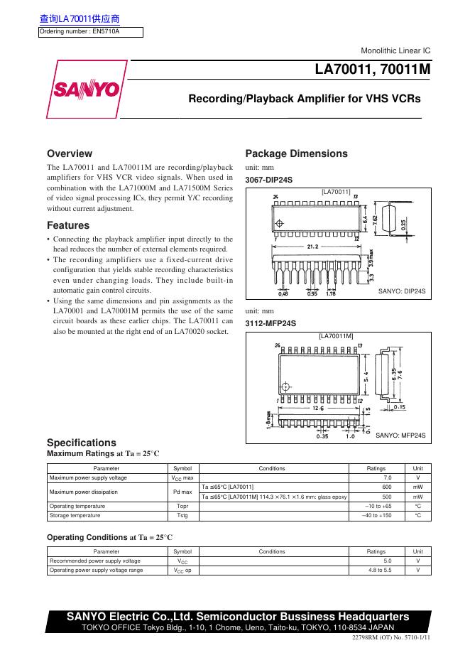 SANYO Electric LA70011, 70011M 数据手册.pdf