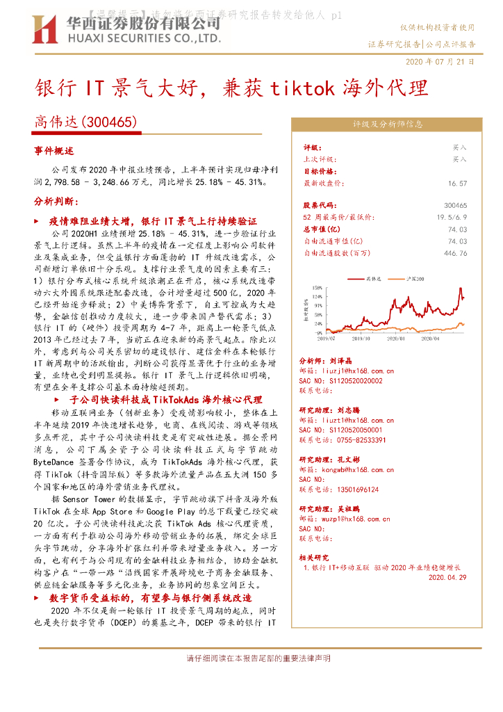 华西证券:高伟达(300465)-银行IT景气大好,兼获tiktok海外代理.pdf