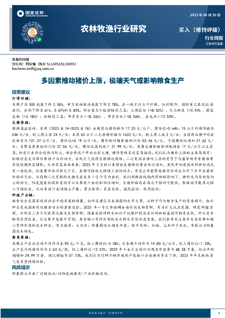 国金证券:农林牧渔行业研究:多因素推动猪价上涨,极端天气或影响粮食生产.pdf