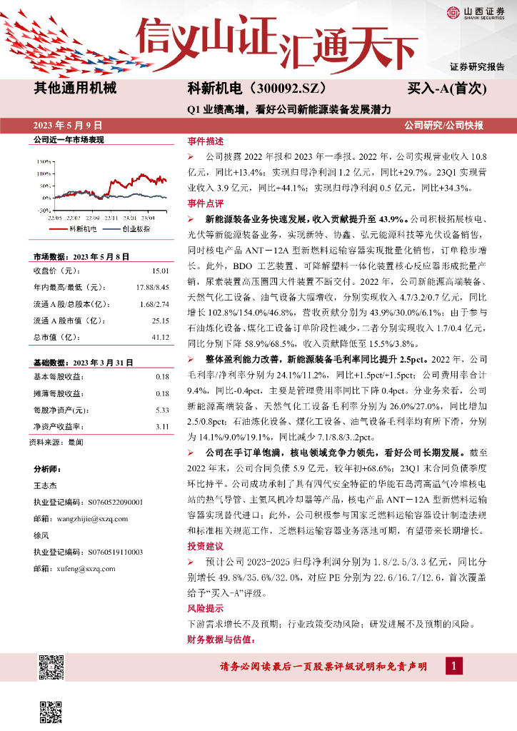 山西证券:科新机电(300092)-Q1业绩高增,看好公司新能源装备发展潜力.pdf