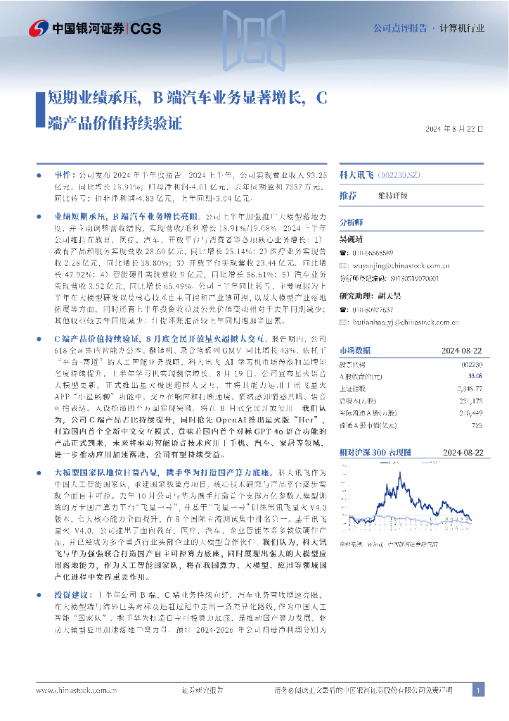 中国银河:科大讯飞(002230)-短期业绩承压,B端汽车业务显著增长,C端产品价值持续验证.pdf