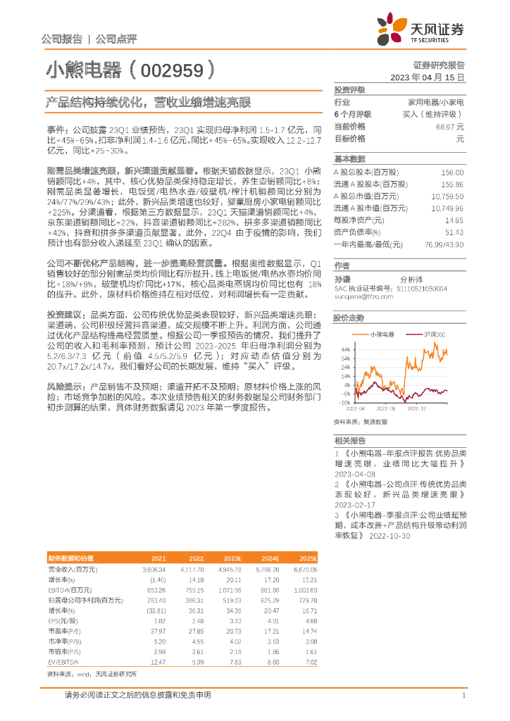 天风证券:小熊电器(002959)-产品结构持续优化,营收业绩增速亮眼.pdf