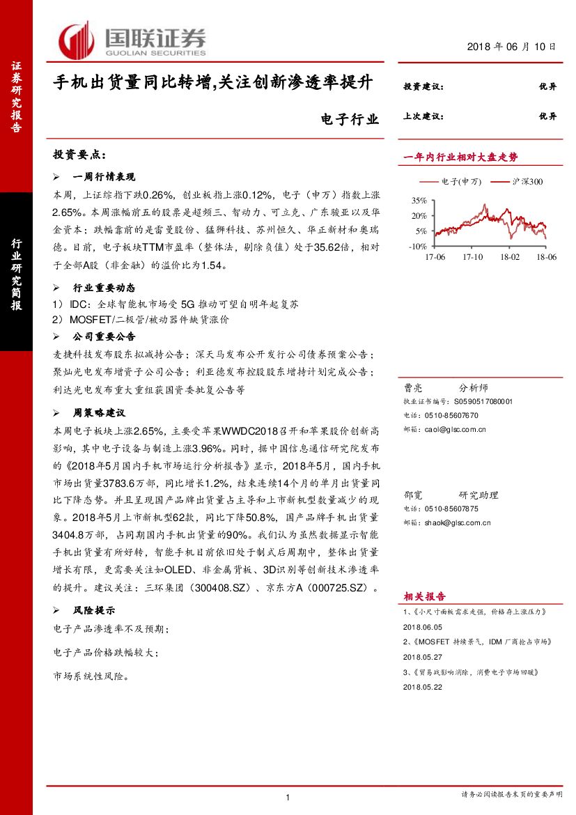 国联证券:电子行业研究简报:手机出货量同比转增,关注创新渗透率提升.pdf