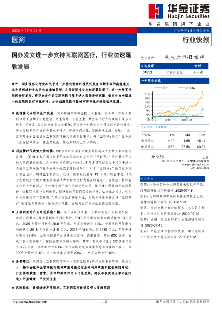 华金证券:医药行业快报:国办发文进一步支持互联网医疗,行业加速蓬勃发展.pdf