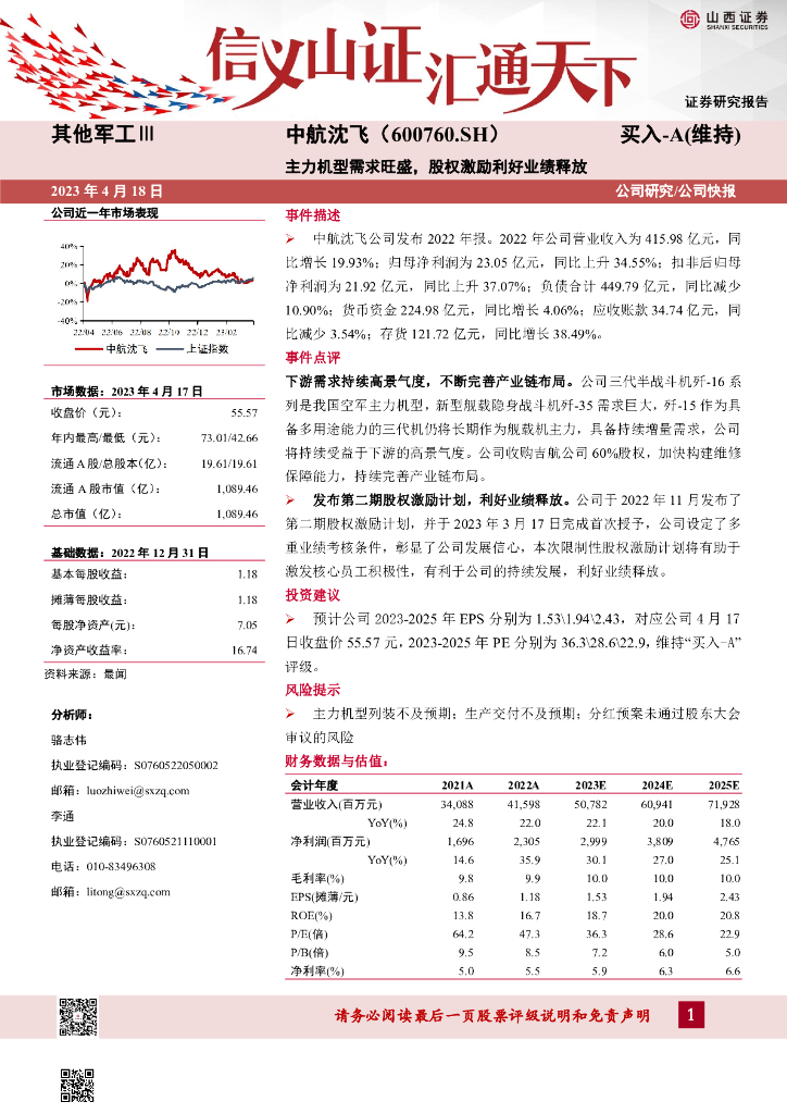 山西证券:中航沈飞(600760)-主力机型需求旺盛,股权激励利好业绩释放.pdf