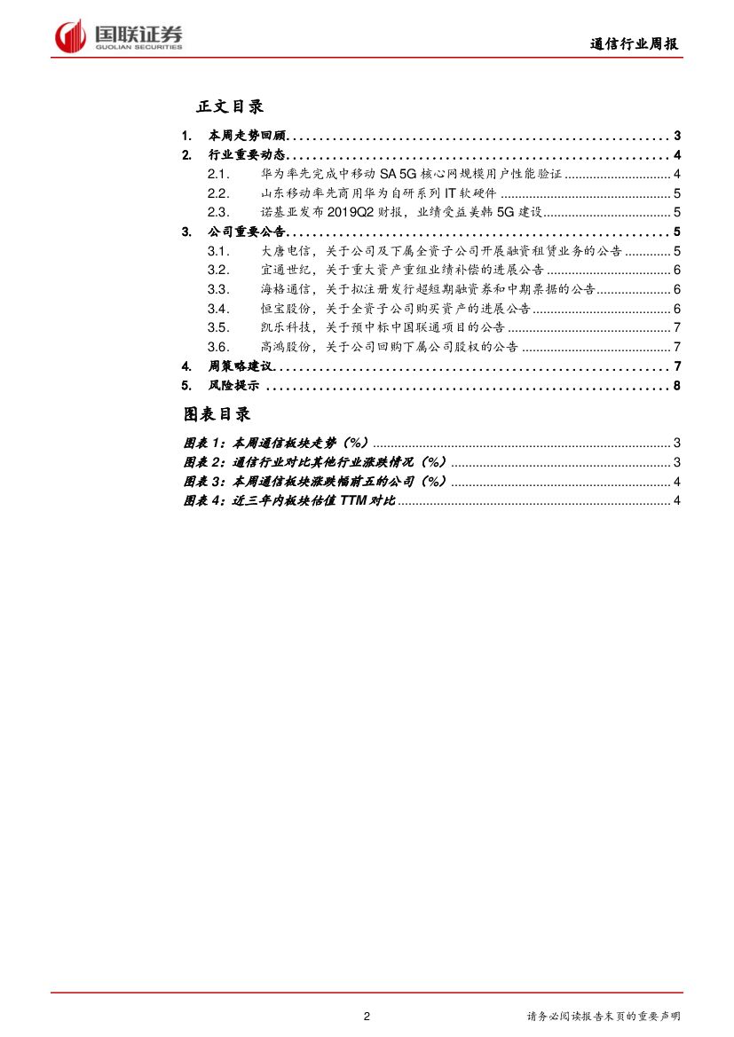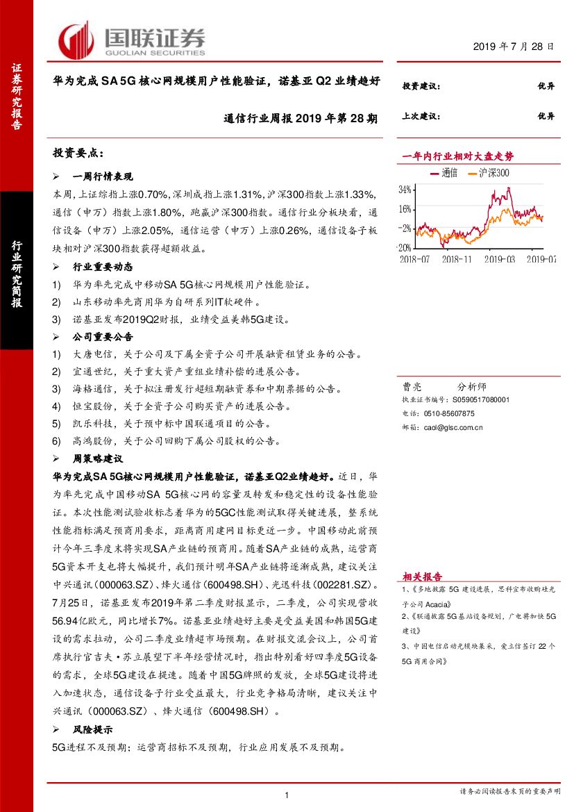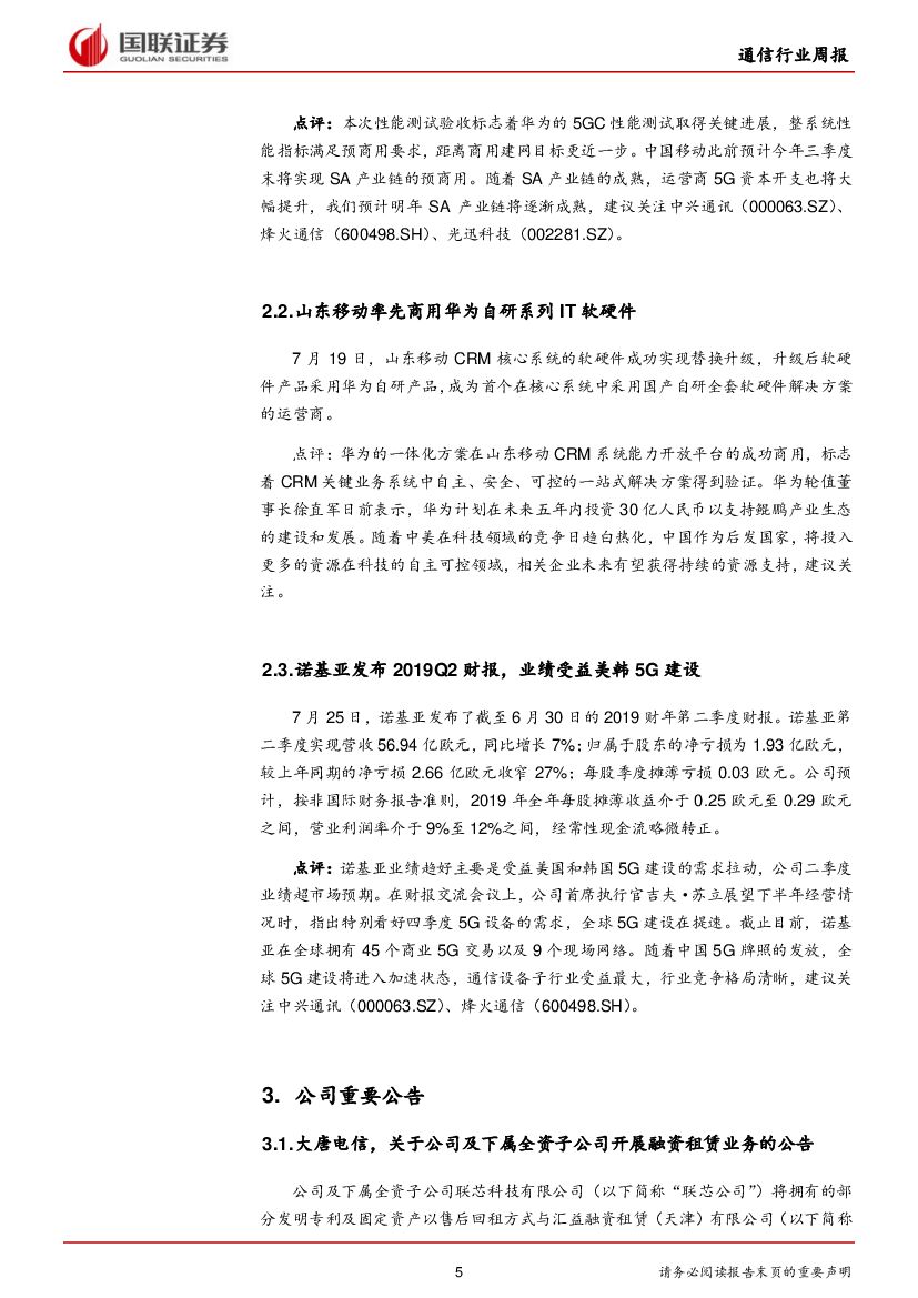 国联证券:通信行业周报2019年第28期:华为完成SA 5G核心网规模用户性能验证,诺基亚Q2业绩趋好.pdf