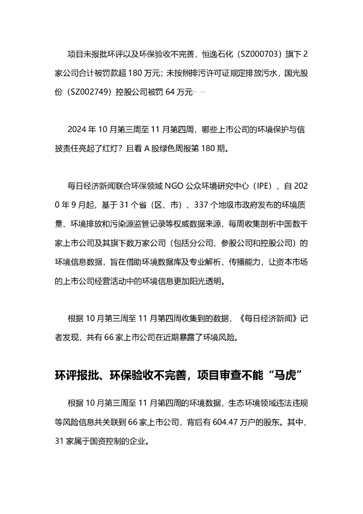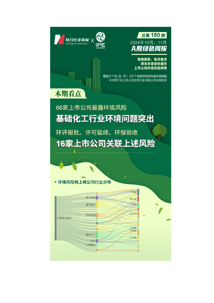 A股绿色周报(2024年10月、11月 总第180期):66家上市公司暴露环境风险 其中16家因环评报批等问题被牵涉.pdf