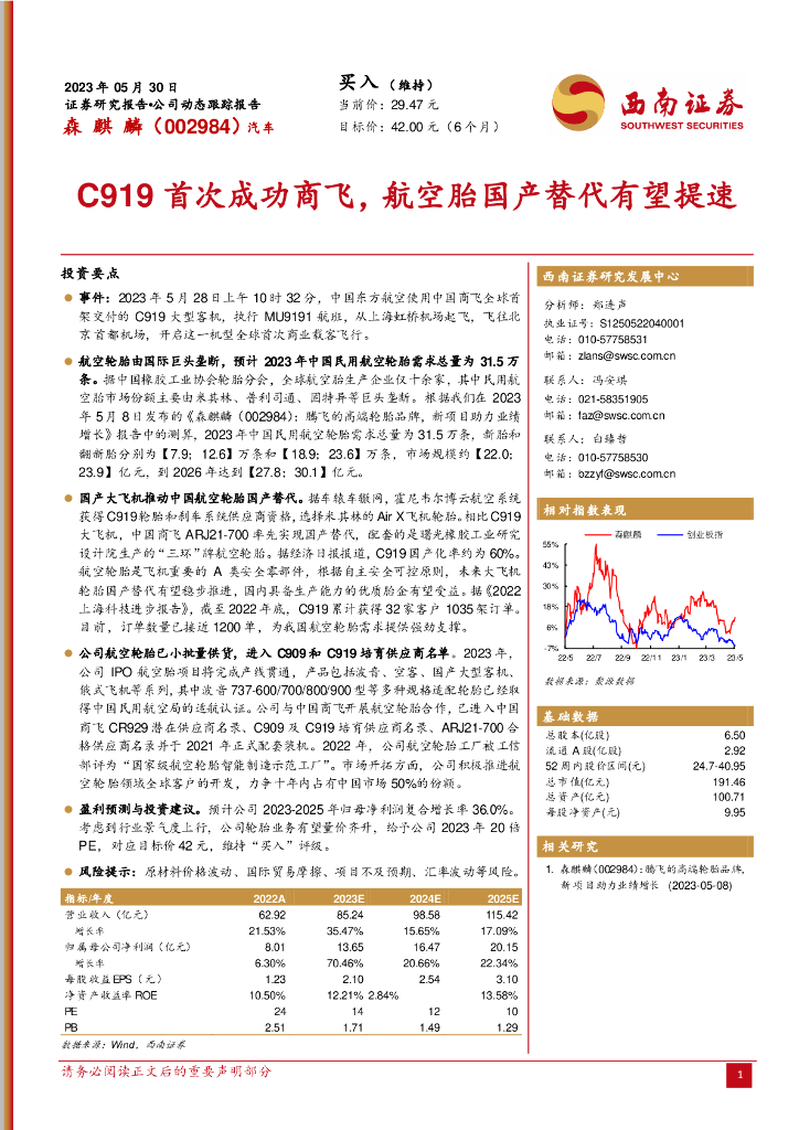 西南证券:森麒麟(002984)-C919首次成功商飞,航空胎国产替代有望提速.pdf